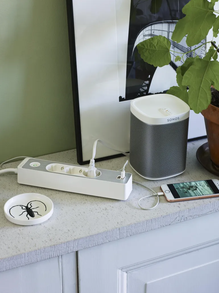 Vahva haaroitusjohto, jonka muotoilu on siisti ja saa mielellään olla näkösällä. Kaltevat pistorasiat.