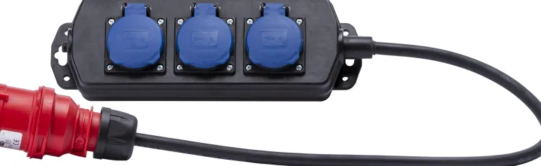 Haaroituspistorasia, jossa siirtymä 400 V:stä 3×230 V:hen Schuko. Haaroituspistorasiassa on itsestään sulkeutuva kansi. Liitäntäkaapeli RDOE (H07RN-F) 5G1,5 ja pistoke CP 416-6 CEE.