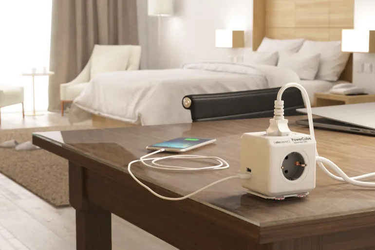 Kompakti 4-osainen 230 V, 16 A haaroitusjatkojohto, joka voidaan sijoittaa haluttuun paikkaan itsekiinnittyvällä telakointiasemalla. Varustettu 2 USB-pistorasialla (2x5V, 2100mA) esim. matkapuhelinten lataamiseen. Johdossa on irrotettava johtokiinnike johdon ripustamiseen.