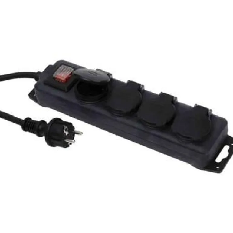 4-osainen maadoitettu 3 m:n haaroitusjatkojohto, jossa on kansi ja kytkin. Hyväksytty ulkokäyttöön, suojausluokka IP44.
