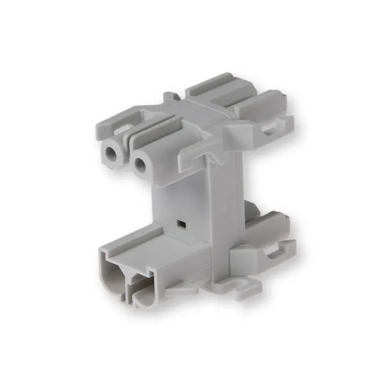 Haaroitusliitin sisältää holkkiliittimen syötön ja kolme pistotulpan ulostuloa. Haaroittimeen liitetyt koskettimet on määritelty kytkentäkaaviossa. Tarvittaessa liitäntälaite voidaan asentaa alustalle kahdella ruuvilla, max. ø 3,5 mm, kiinnitysreikien väli 58 mm.
