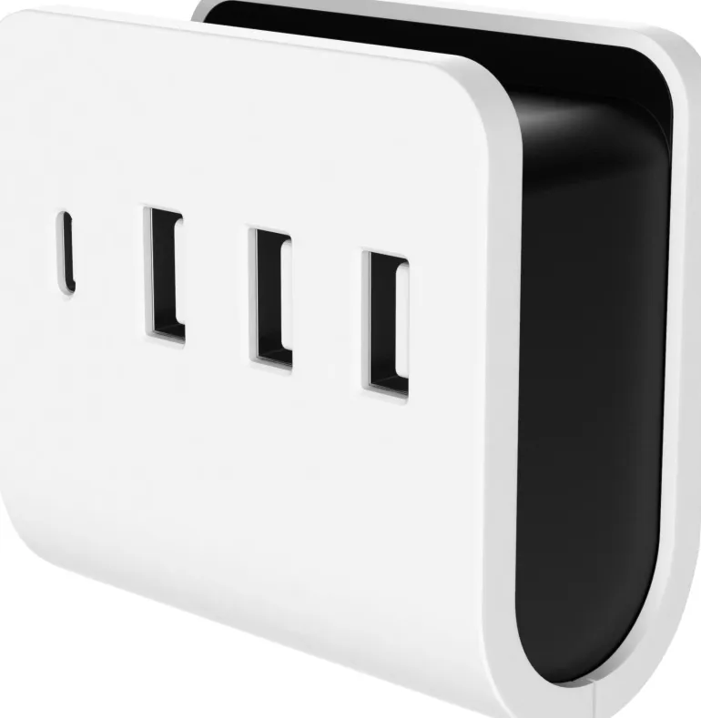 Valkoinen haaroituspistotulppa, jossa on 3 USB-A-pistorasiaa, 1 USB-C-pistorasia ja sisäänrakennettu taso puhelimelle latauksen aikana. USB-yhteensopivien laitteiden, kuten matkapuhelinten, tablettien, kameroiden, GPS-laitteiden jne. lataamiseen.