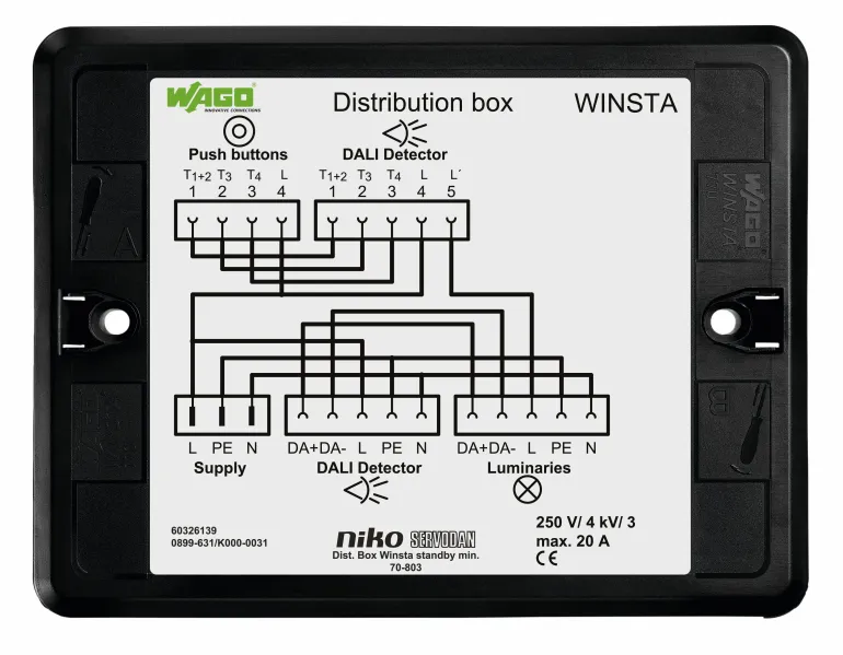 Winsta-haaroitusrasia minimoi valmiustilan DALI-master-läsnäoloanturin avulla. Rasia mahdollistaa valaisimien virransyötön katkaisemisen kokonaan (0 wattia), kun valaistus ei ole päällä. Mukana pikaliitin painikkeeseen, 4-napainen urosliitin, Winsta-mallit 770-254 + 770-504, pikaliitin syöttöjännitteeseen, 3-napainen naarasliitin, Winsta-malli 770-103.