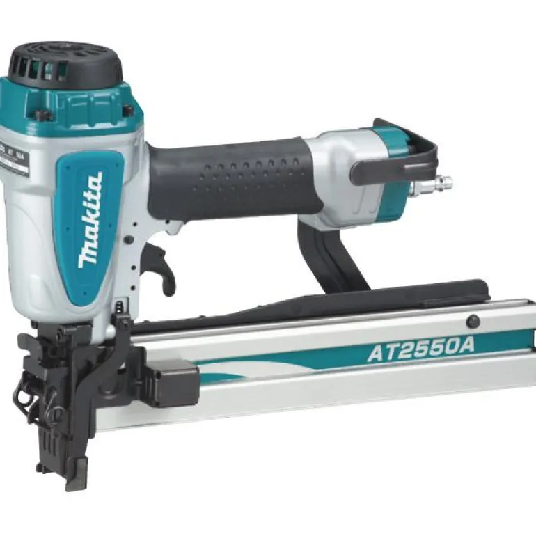 Makita AT2550A on paineilmakäyttöinen hakasnaulain. Kestävä rakenne. Kädensijan kumipinnoite takaa tukevan työskentelyotteen.