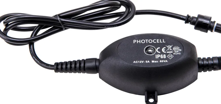 Hämäräkytkin (hämärätunnistin) 12V-puutarhavalaisimille. Käytetään saadakseen valaisimet syttymään pimeän tullessa ja sammumaan päivänvalon tullessa takaisin.