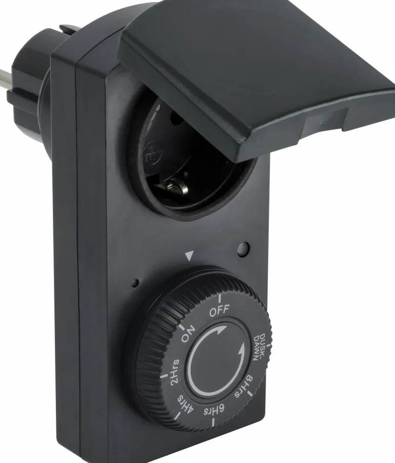 Hämäräkytkinrele ajastimella ja valokennoilla, jotka tunnistavat valon määrän (5-75 luksia). Kytketään tavalliseen 230V:n pistorasiaan, kytkee virran automaattisesti päälle hämärässä ja pois päältä aamunkoitteessa. Ajastimessa on myös oletusasetukset, joissa virta kytketään päälle iltahämärässä ja sen jälkeen pois päältä 2, 4, 6 tai 8 tunnin kuluttua.