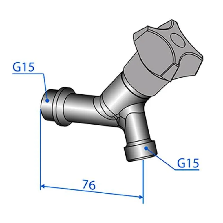 Kromattu hanaventtiili seinään, vakiomalli. Mukana letkuliittimet. Hanaventtiilin ulkonema on 76 mm, G15-ulkokierre liitäntää varten.
