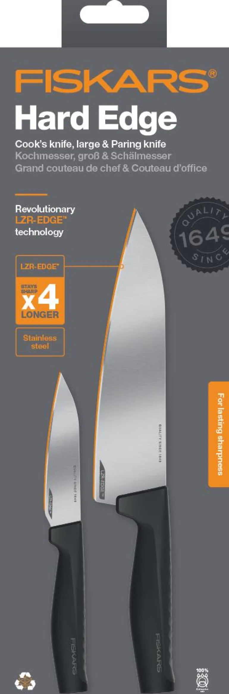 Hard Edge-veitsisetti, joka sisältää ison kokinveitsen sekä vihannesveitsen. Fiskars Hard Edge -veitsisarja tarjoaa pitkäkestoista terävyyttä päivittäiseen ruuanlaittoon. Iso Hard Edge -kokinveitsi on hyvä yleisveitsi isompien ruokien kuten lihan ja vihannesten leikkaamiseen. Pienempi Hard Edge -vihannesveitsi on puolestaan täydellinen erilaisten hedelmien ja kasvisten paloitteluun ja pilkkomiseen.