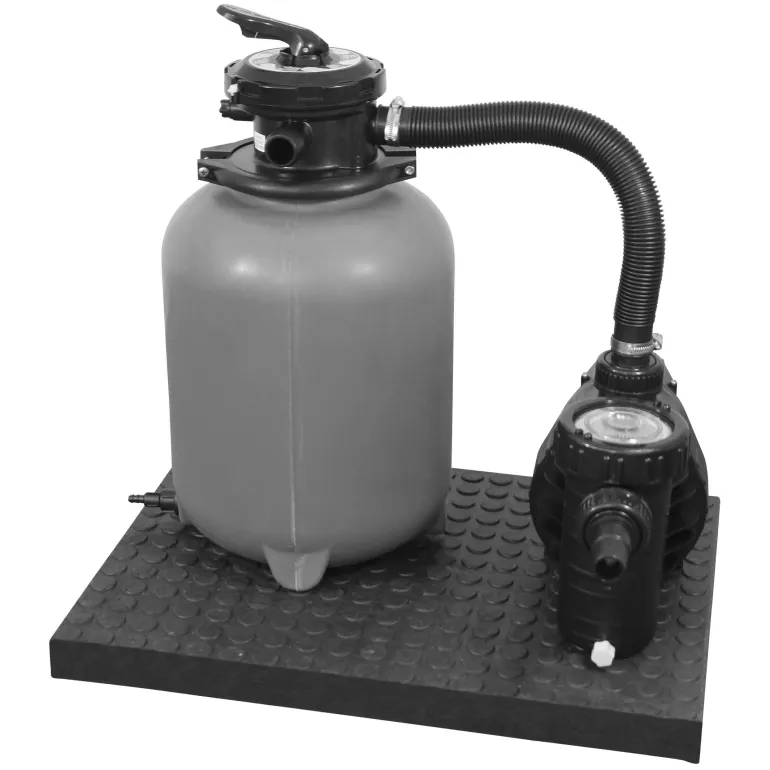 Hiekkasuodatinjärjestelmä M, 6 m³/h, itse imevä Aqua Plus 6 -pumppu, jossa on esisuodatin, suodatinlevy, 6-tieventtiili ja 450 W:n (230 V / 50 Hz) ottoteho. Järjestelmässä on myös Ø 300 mm:n suodatinsäiliö, jossa on Ø 38 mm:n letkuliitin ja noin 25 kg täyttömäärä hiekalle. Mukana suodatinsäiliö, pumppu ja putkiliittimet. Hiekka ei sisälly hintaan.
