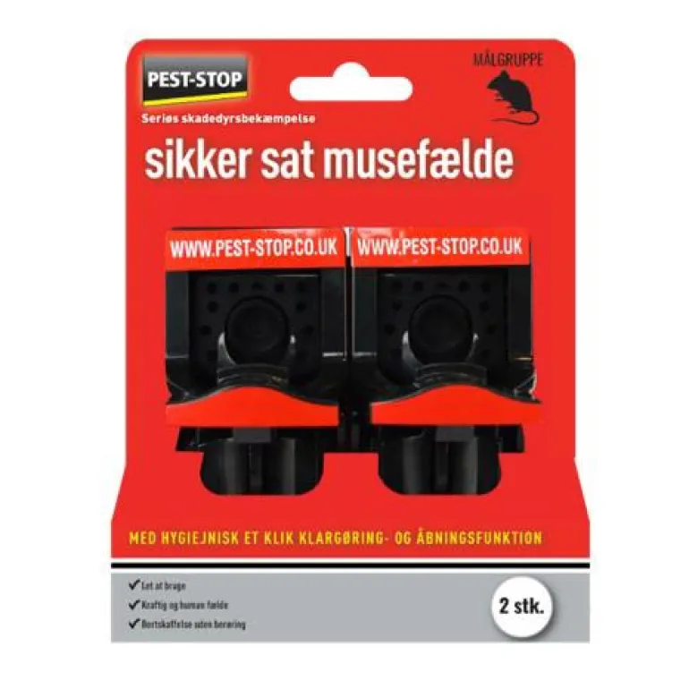 Pest-Stop Sikker Sat on helppokäyttöinen hiirenloukku, joka on käyttövalmis vain yhdellä napsautuksella. Hiirenloukun käyttö on hygieenistä, koska eläintä ei tarvitse koskettaa loukkua tyhjennettäessä.