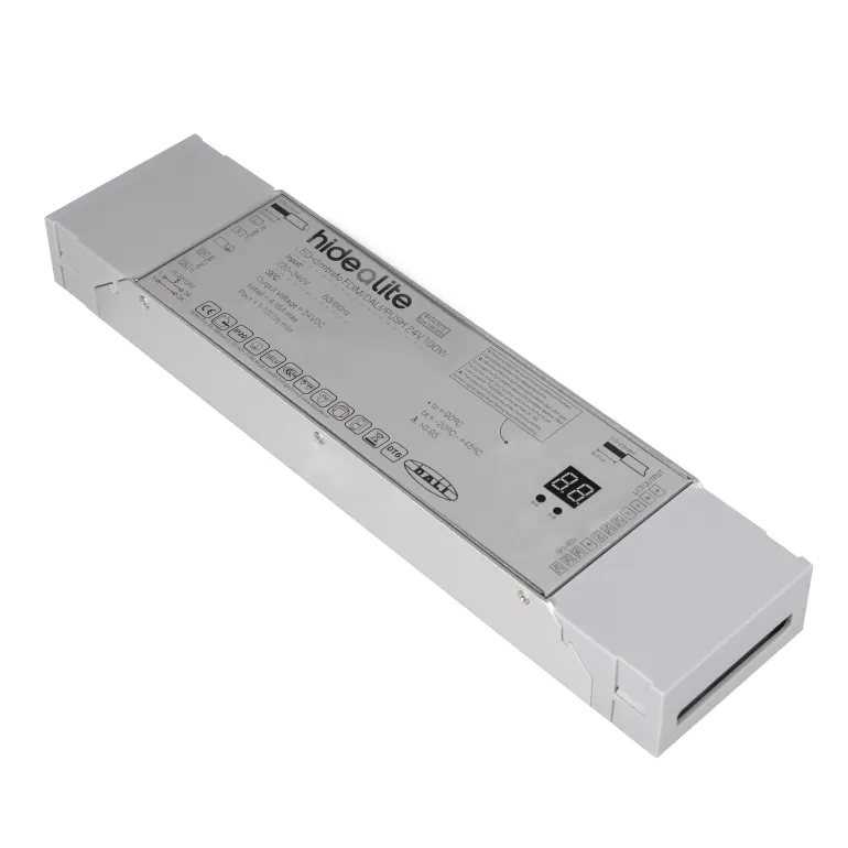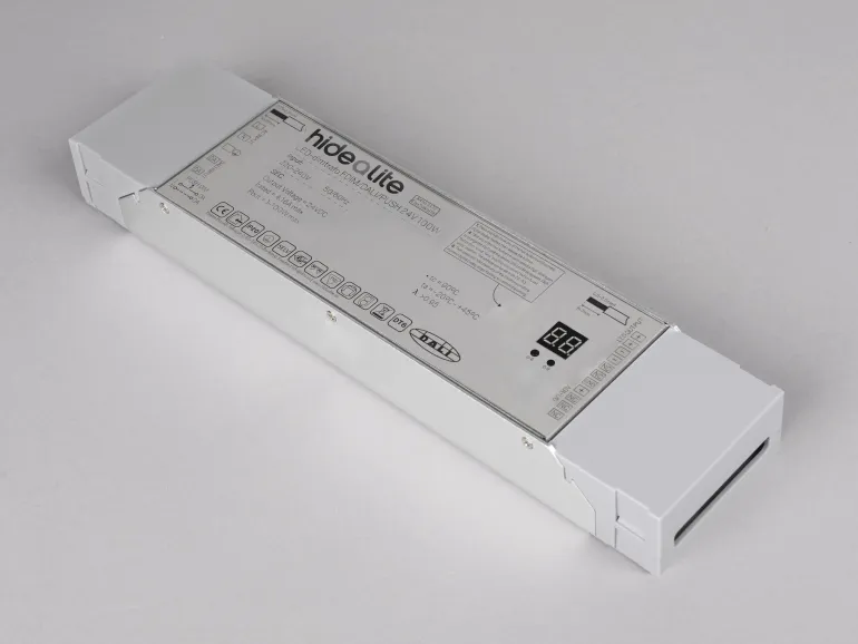 Hide-a-Lite Dali/Push/FDIM on tehokas himmenninmuuntaja 24 V LED-nauhoille. Ihanteellinen yksiväristen LED-nauhojen vaihehimmennykseen kiertohimmentimellä. Myös Push (230 V)-, DALI- tai 0/1-10 V -himmennys. Muistitoiminto sytyttää sähkökatkon jälkeen viimeksi asetettuihin arvoihin.