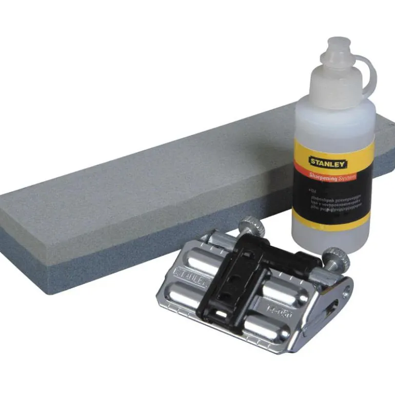 Hiomakivisarja, joka sisältää hiomakiven, pidikkeen ja öljyn. Valmiilla merkinnöillä (25°, 30° ja 35°) varustettu kulmasäätö auttaa käyttäjää saamaan terävän reunan oikealla kulmalla.