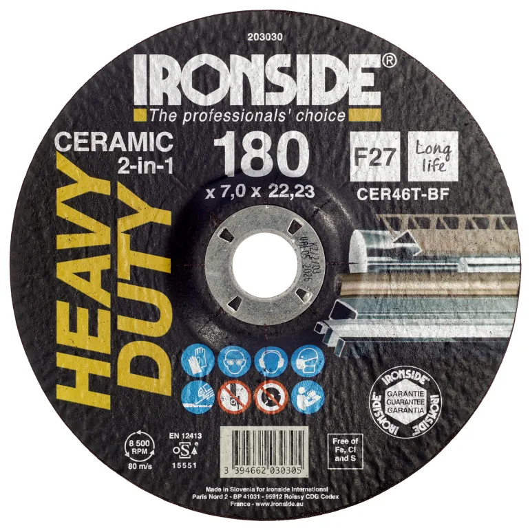 Ironside 203030 on keraaminen hiomalaikka teräksen ja ruostumattoman teräksen hiontaan kulmahiomakoneella. Korkealaatuinen laikka itseteroittuvilla keraamisilla rakeilla. Rakenne pidentää käyttöikää ja mahdollistaa tehokkaamman materiaalinpoiston vähemmällä voimalla. Alempi työskentelylämpötila. Soveltuu raudalle, teräkselle ja ruostumattomalle teräkselle.
