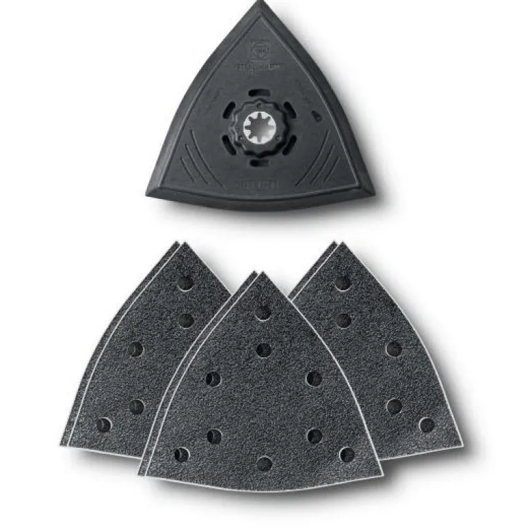 Kolmion muotoinen ja rei’itetty tarranauhalevy hiontaan, pölynpoisto. Vaahtokumipinnoitteinen kiinnityslevy ehkäisee vaurioita ja työkappaleeseen jääviä jälkiä.