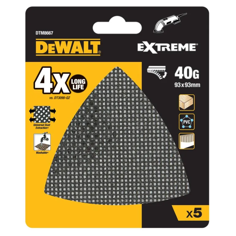 Hiomaverkon avoin rakenne minimoi tarkan asemoinnin tarpeen. Tarranauhakiinnike kiinnittyy nopeasti hiomakoneeseen ja pitää arkin paikallaan. Sopii puun ja maalattujen pintojen hiontaan. Piikarbidirakeiden ansiosta käyttöikä on jopa neljä kertaa pidempi kuin DEWALT-vakioarkeilla. Pöly voidaan helposti pestä pois. Kuivauksen jälkeen verkko on taas käyttövalmis. Soveltuu käytettäväksi kaikkien yleishiomakoneiden kanssa.
