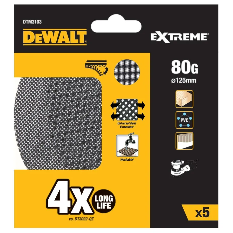 Hiomaverkon avoin rakenne minimoi tarkan asemoinnin tarpeen. Tarranauhakiinnike kiinnittyy nopeasti hiomakoneeseen ja pitää arkin paikallaan. Sopii puun ja maalattujen pintojen hiontaan. Piikarbidirakeiden ansiosta käyttöikä on jopa neljä kertaa pidempi kuin DEWALT-vakioarkeilla. Pöly voidaan helposti pestä pois. Kuivauksen jälkeen verkko on taas käyttövalmis. Soveltuu käytettäväksi kaikkien yleishiomakoneiden kanssa.
