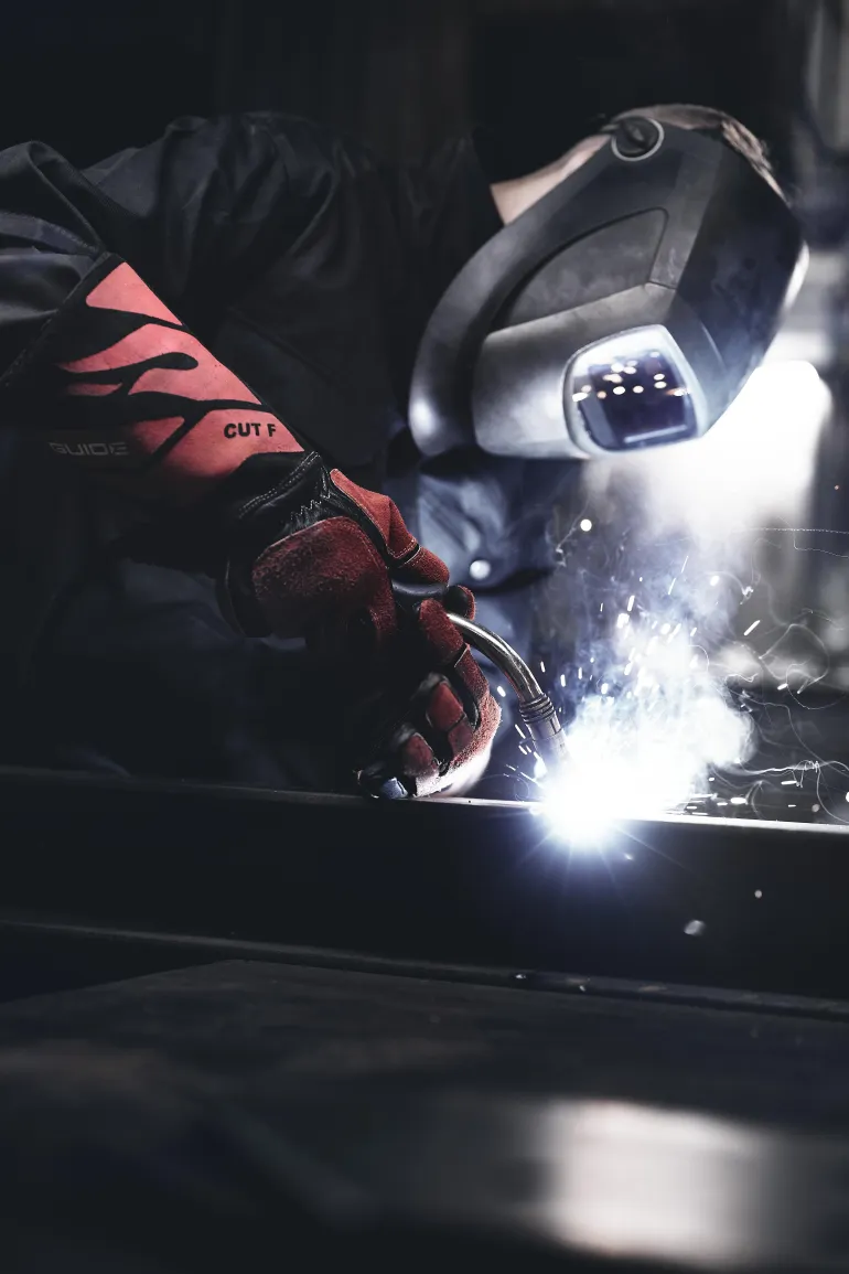 Korkean suorituskyvyn hitsaus- ja lämpösuojakäsine, jossa viiltosuojaustaso F. Pehmeästä vuohennahasta valmistettu pehmustettu kämmenpuoli käyttömukavuutta varten.