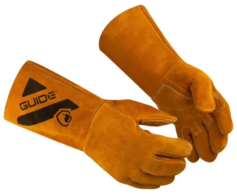 Guide Gloves 3570 on hitsaus-/lämpökäsine laadukkaasta naudan haljasnahasta. Käsineessä on pitkä ranneke,vahvistettu kämmen ja puuvillavuori. Soveltuu tehtäviin kuumissa ympäristöissä, sopii MIG- ja MAG-hitsaukseen. Saumat kuumuutta kestävää Kevlar-lankaa.