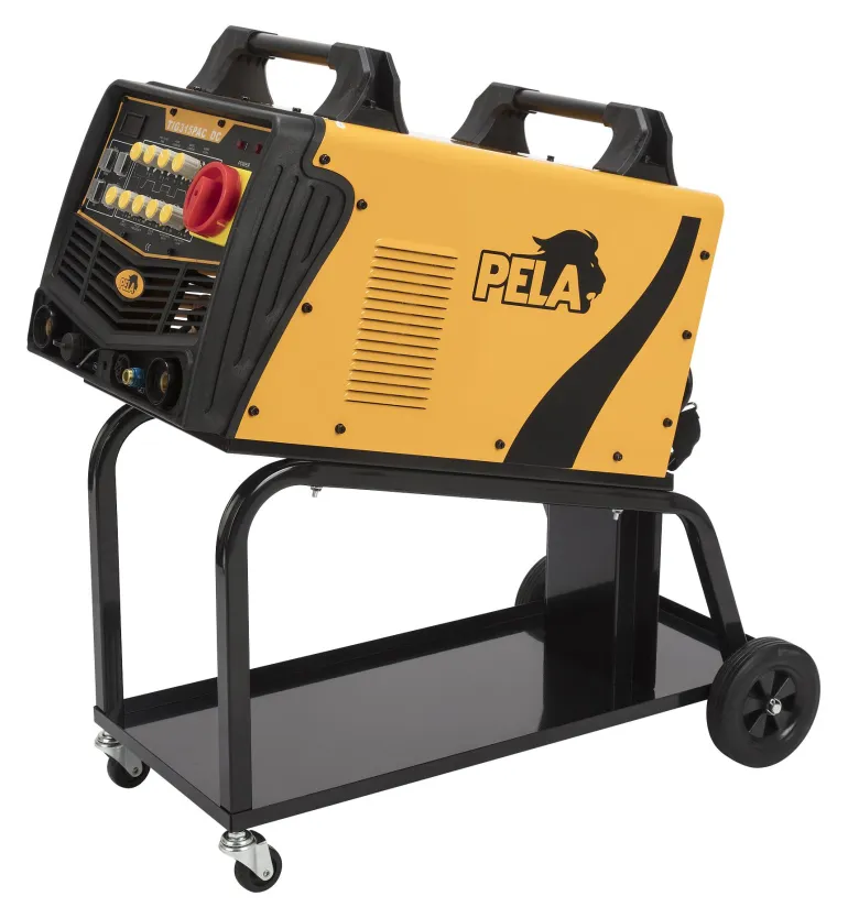 Pela 488476 on hitsausvaunu tukevalla teräsrakenteella, hylly hitsauskoneelle kallistettu helppoa säilytystä ja käyttöä varten.