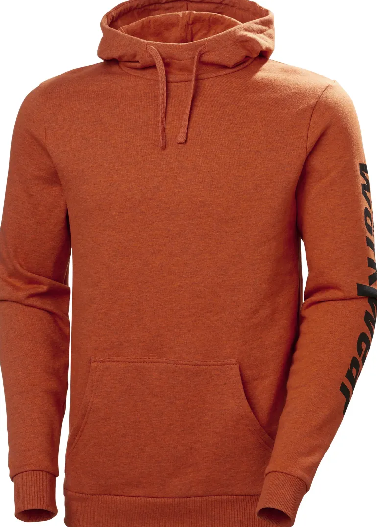 Oranssi H/H Workwearin huppari, jossa etutasku ja painatus vasemmassa hihassa.