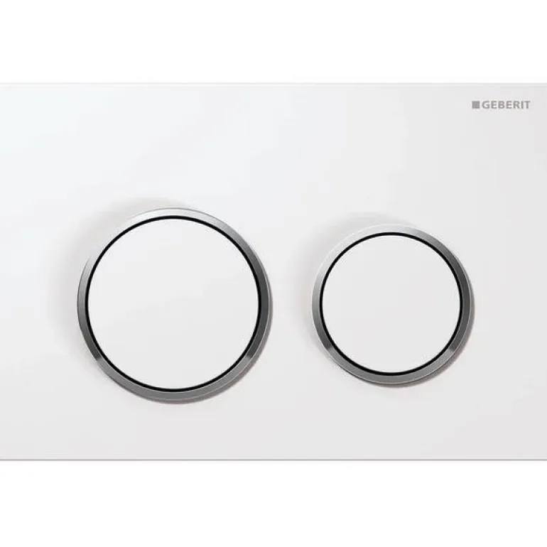 Huuhtelulevy, pieni malli, kaksitoimisella huuhtelulla. Valkoinen, kiiltävät kromikoristeet. Uppoasennettavien Geberit Omega -säiliöiden huuhteluun. Käyttö ylhäältä/edestä.