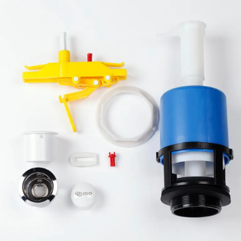 IDO Trevi -huuhteluventtiili (IDO Trevi B) huuhtelupainikkeella, StopNoise-sillalla, StopNoise-pohjaventtiilillä, säiliökannen holkilla ja mutterilla.