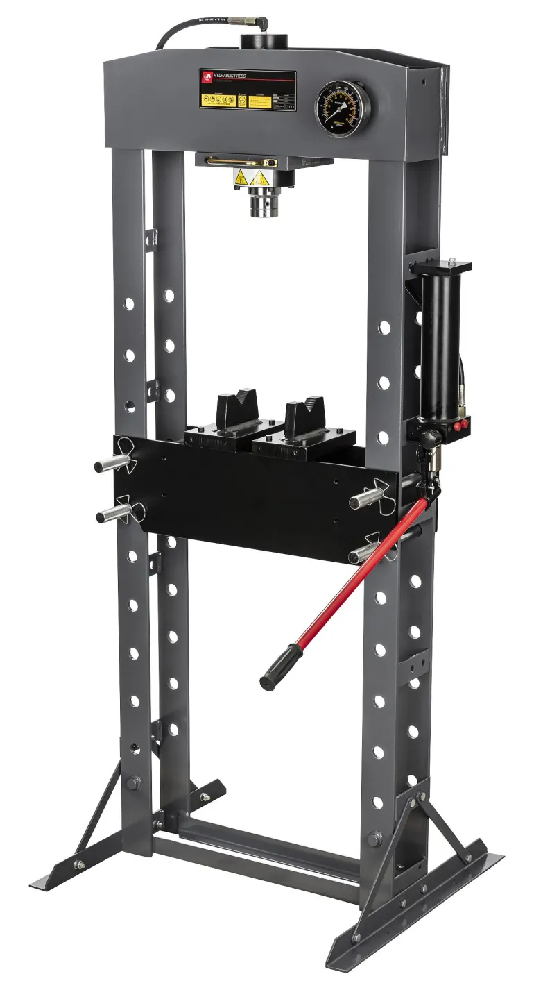 Voimakas teollisuusmallinen hydraulipuristin (hydrauliprässi). Mukana 2 vahvaa puristuslevyä.