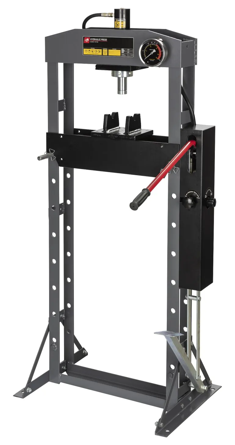 Voimakas teollisuusmallinen hydraulipuristin (hydrauliprässi) jalkapoljinohjauksella. Mukana 2 vahvaa puristuslevyä.
