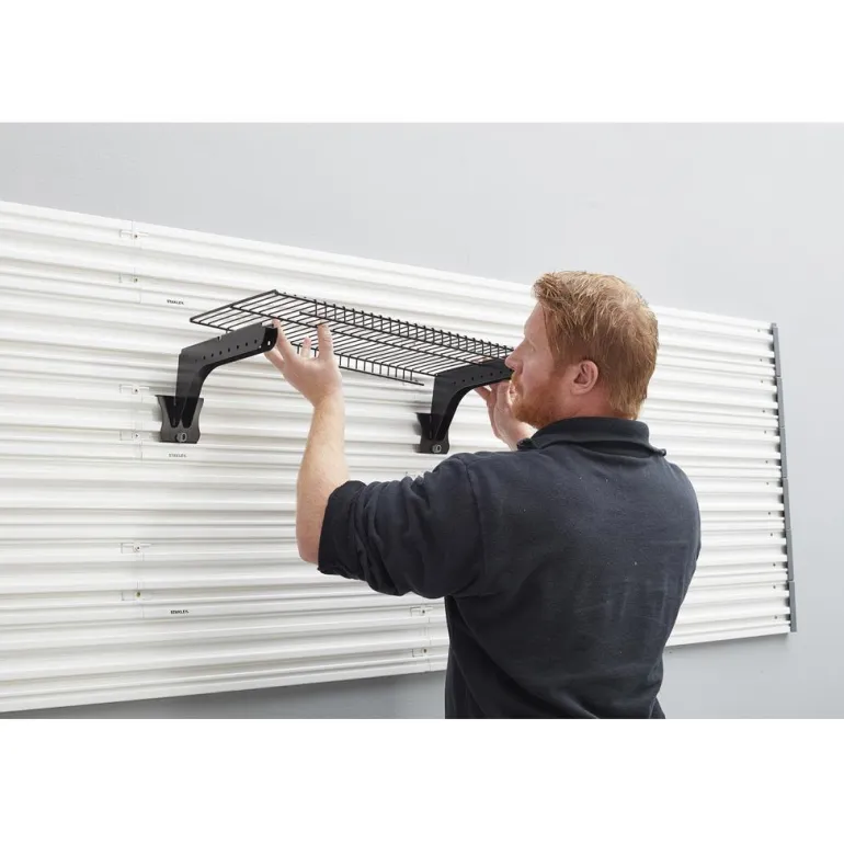 Hyllykonsoli seinäkiskoon. STANLEY® Track Wall System -kiskon kanssa STANLEY® Track Wall System -lankahylly tai muu 25,5 cm syvä hylly on helppo asentaa. Täydellinen pienten työkalujen, varusteiden ja tarvikkeiden säilyttämiseen. Tarvitset 2 konsolia.