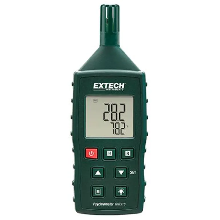 Extech RHT510 on ilmankosteusmittari, joka mittaa ilman suhteellisen kosteuden, lämpötilan, kastepisteen ja märkälämpötilan. LCD-näyttö, min/max-toiminnot ja hold-toiminto.