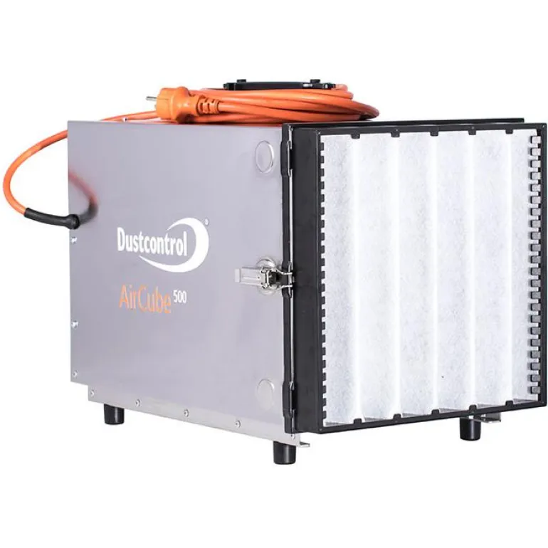 Dustcontrol DC AirCube 500 on ilmanpuhdistin 210 W, kapasiteetti 500 m3/h. Soveltuu pienemmälle työpaikalle tai täydentämään pisteimua. Ilmanpuhdistimessa on kaksivaiheinen ohjaus ja se käyttää esisuodatinta ja HEPA H13 -mikrosuodatinta erittäin tehokkaaseen erotteluun.