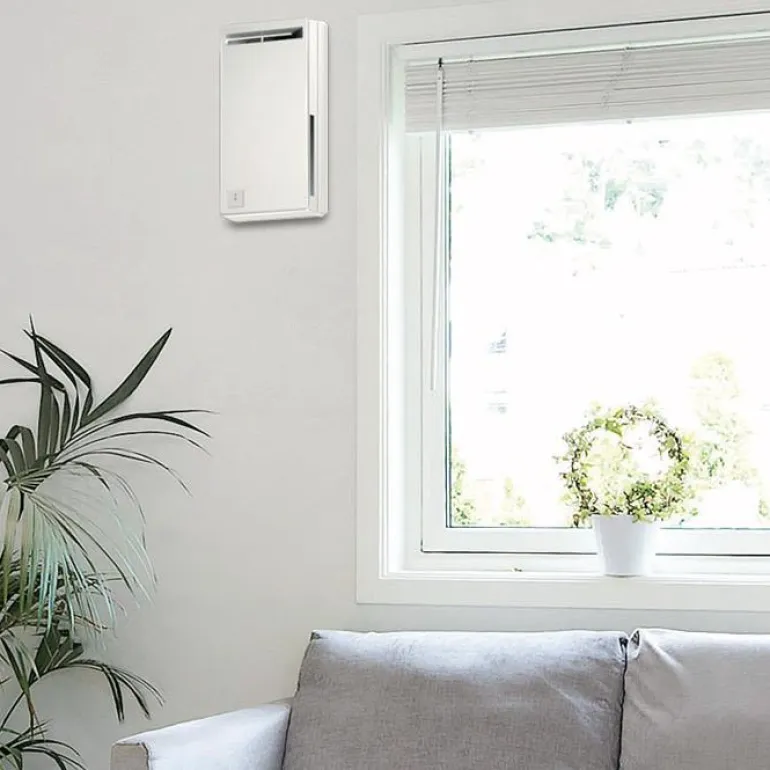 Haju, home, siitepöly, radon ja monet muut samanlaiset tekijät vaikuttavat sisäilmaan ja sisätiloissa oleskelevien hyvinvointiin. Ikkunoiden pintaan kertyvä kosteus on eräs merkki huonosta ilmanvaihdosta. Ilmanvaihtolaitteemme ansiosta parannat sisätilojesi energiatehokkuutta, sillä sen lämmönkierrätystoiminnon ansiosta lämpötilatehokerroin on jopa 85 %. Ilmanvaihtolaitteemme on kapeasti muotoiltu sopimaan kotiympäristöön ja sen äänieristyksen ansiosta se on myös hyvin hiljainen. Näin arkesi ei häiriinny! Tämä ilmanvaihtolaite kattaa enintään 80 m² tilan. Asennus on erittäin helppoa – tarvitset vain yhden reiän seinään ilmanvaihtoputkea varten. Asennus vaatii yleensä vain muutaman tunnin, ja jos olet kätevä käsistäsi, voit asentaa sen aivan itse.