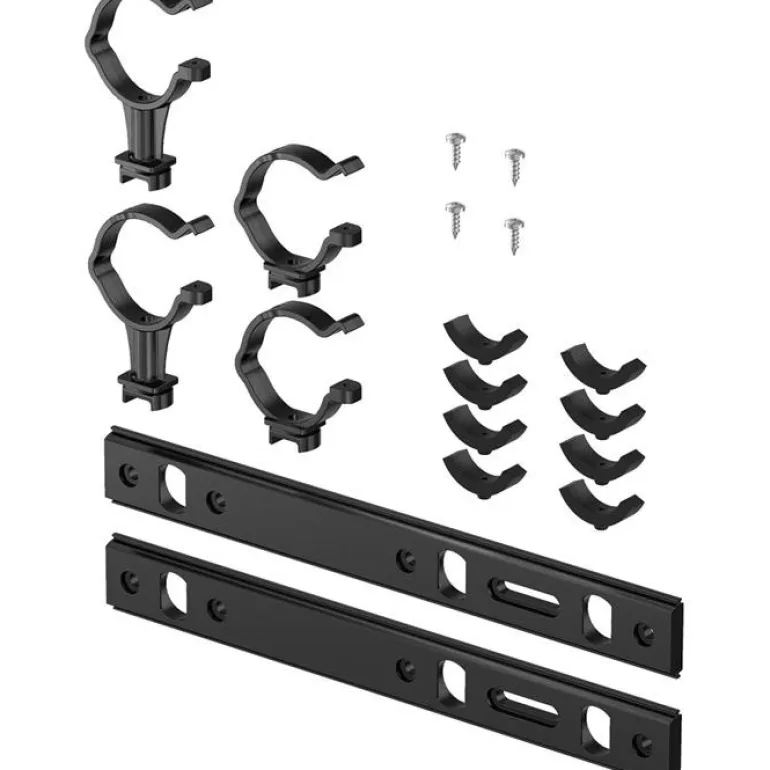 18-osainen jakotukin kannatin kiinnikkeineen, klipseineen, välilevyineen ja ruuveineen, seinäasennukseen. Osat ovat mustaa muovia.