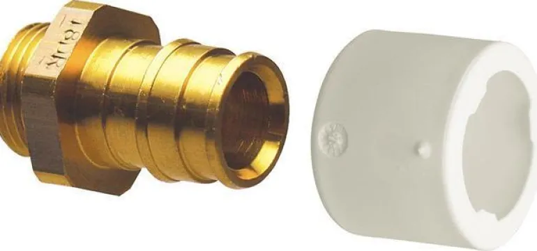 Jakotukin sovitin messingistä, putken ulkohalkaisija 18×18 mm. Mallissa on O-rengastiiviste ja sitä käytetään Q&E-jakotukkien irrottamiseen ja syöttämiseen vaihdettavilla nipoilla.