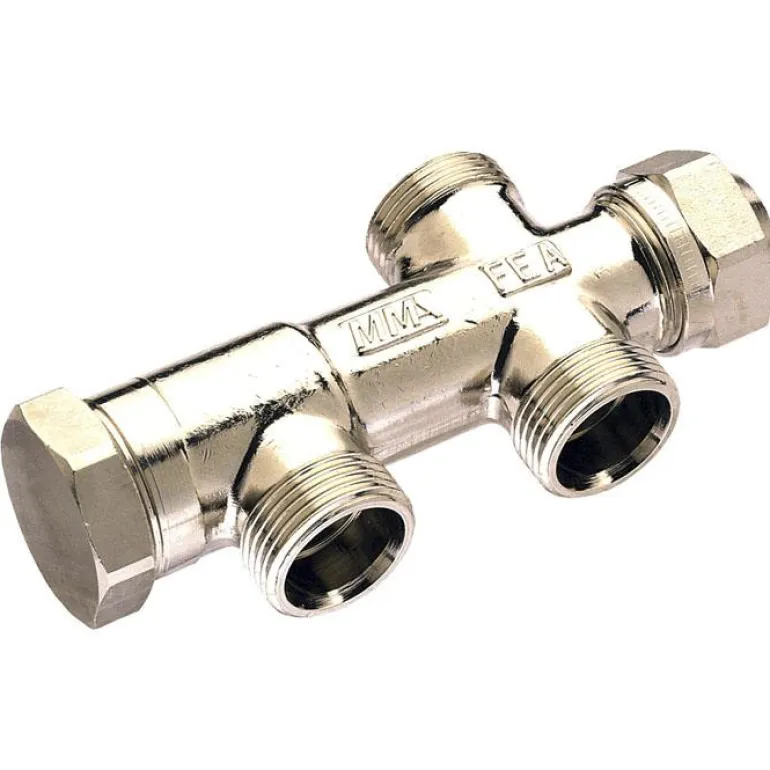 Messingistä valmistettu jakotukki ja EFDPM-tiivisteet, käännettävissä ala-/ylä- tai sivuliitäntään ja mukana sisäänrakennettu sulku. Sulkukaralla, joka on piilossa kannen takana, 10 mm kuusioavainkahva. Suurin paine-ero/sulkemispaine on 250 kPa.