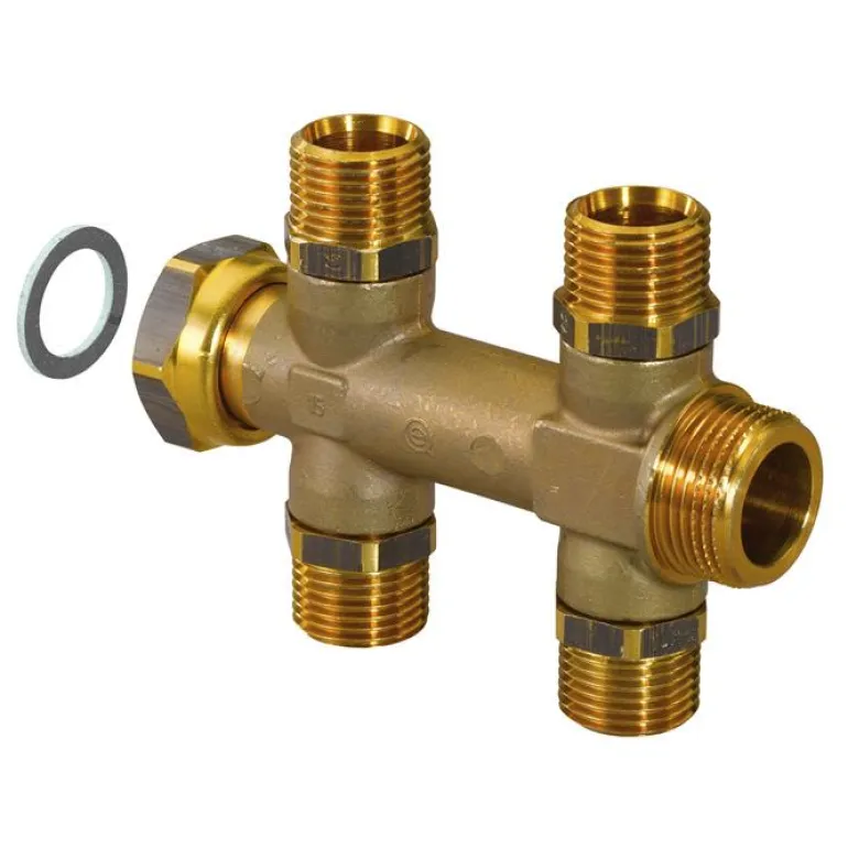 Jakotukki, jossa on 2 x 2 piiriä ja 50 mm keskietäisyys. Jakotukissa on sisä- ja ulkokierteet sekä pyörivät mutterit. Neljä vaihdettavaa G½ ulkokierteistä nippaa ja suora muoto.
