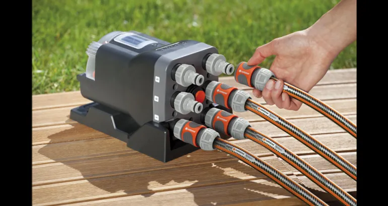 Koska eri kasvit puutarhassa tarvitsevat erilaisia määriä vettä, kasteluohjaimen ohjelmasta voi erikseen määrittää, kuinka kauan kastelun pitäisi kestää. Jakoventtiili ohjaa halutun määrän oikeaan paikkaan. Tämä älykäs ratkaisu on täydellinen myös silloin, kun käytettävissä oleva vesimäärä ei riitä samanaikaiseen vedenjakeluun kaikille kastelutarvikkeille. Asenna jakoventtiili talon seinään tai maahan. Se on kiinnitetty pohjalevyyn ja voidaan poistaa milloin tahansa. Kaikki vedenottoaukot ovat samaan suuntaan, joten laite ei vie paljon tilaa. Jakoventtiili on varustettu 26,5 mm:n (G 3/4) uroskierteellä ja siinä on viisi liitintä ja kolme päätykorkkia.