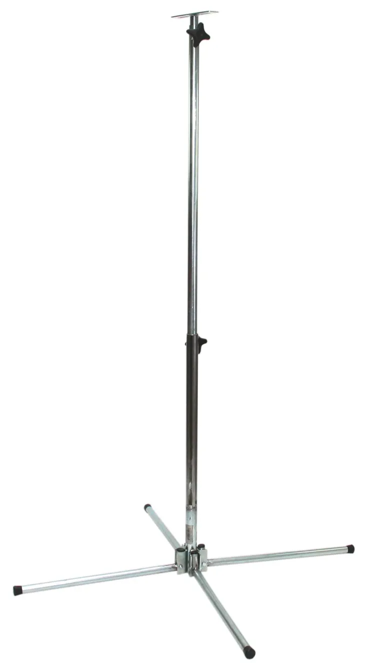 Vankka työvalaisinteline. Tukijalat menevät ristiin, mikä voi säästää tilaa työpaikalla.