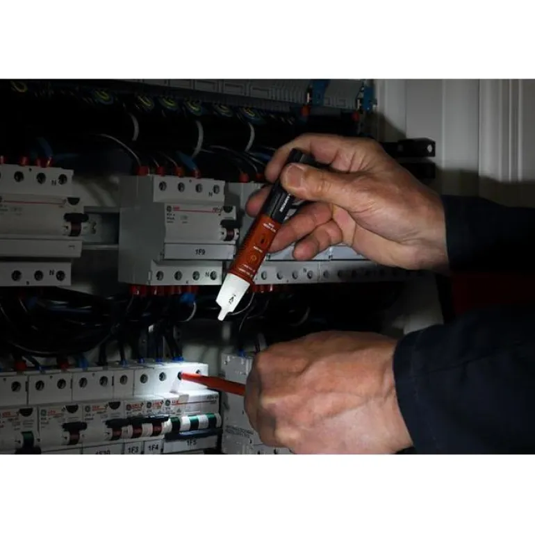 Kosketukseton jännitteenilmaisin, jännitealue 12–50 V AC, 50–1000 V AC, 50–400 Hz. Vaihtojännitteen havaitsemiseen sähköjärjestelmää häiritsemättä.