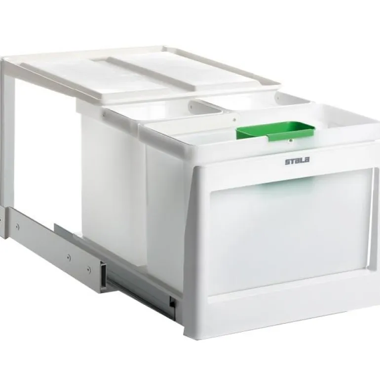 Kiskoilla liikkuva kannellinen jätevaunu kahdella 10 litran astialla, yhdellä 16 litran jäteastialla sekä ongelmajäteastialla. Kaapin minimileveys on 45 cm.