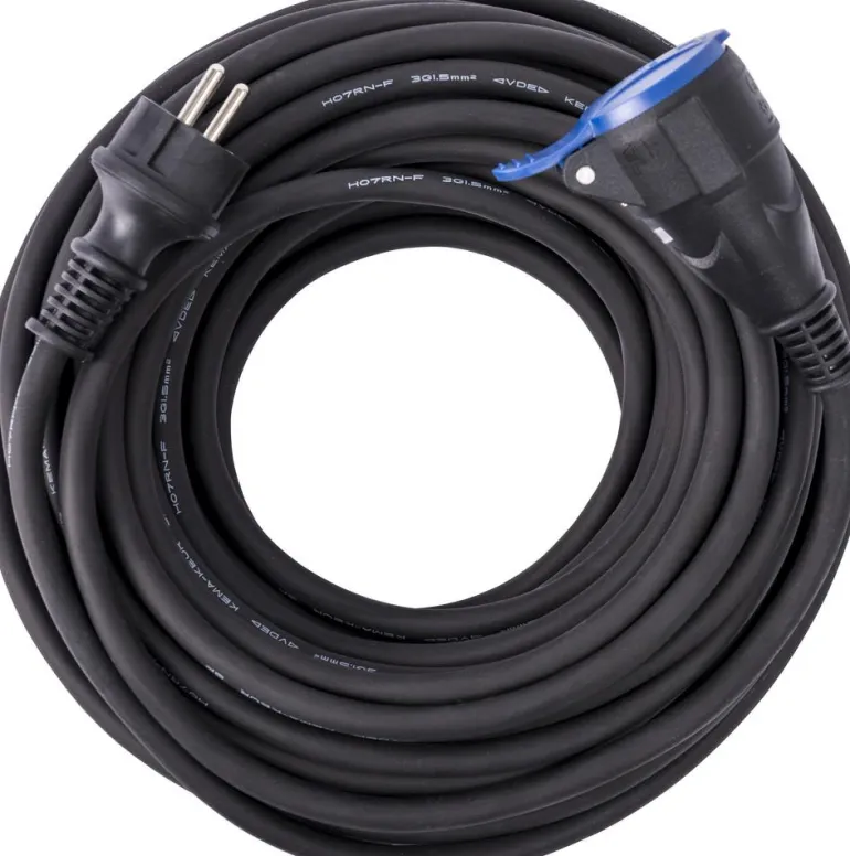 Erittäin kestävä kumikaapeli. Jatkojohto on varustettu erityisen kestävästä kumista valmistetulla tartuntaystävällisellä pistokkeella ja pistorasialla. Kaapeli RDOE (H07RN-F). Hyväksytty ulkokäyttöön. Jatkojohdossa on pistoke ja itsesulkeutuvalla kannella varustettu, uuden standardin mukainen pistorasia.