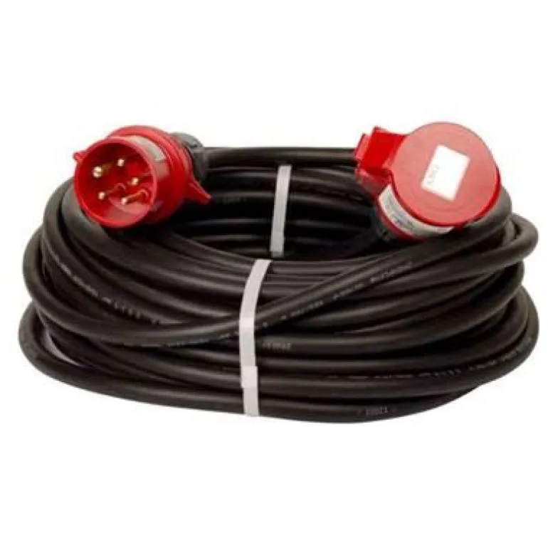 20 m:n jatkojohto 3-vaihevirralle, maks. 400 V, 16 A, valmiiksi asennettu erittäin laadukas pistorasia. Hyväksytty ulkokäyttöön suojausluokituksen IP44 mukaisesti.