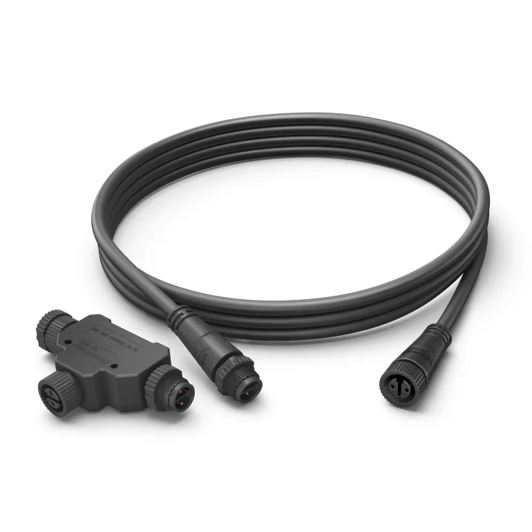 Pidennä Philips Hue -ulkovalaisimien virtalähteen ja kokoonpanosi ensimmäisen valaisimen väliä tai pidennä valaisimien väliä jopa 35 metrillä ulkokäyttöön tarkoitetun jatkokaapelin avulla. Johto on 2,5 m pitkä ja toimii lyhyempänä vaihtoehtona 5 m kaapelille, mikä helpottaa käyttöä ja asennusta silloin, kun 5 m pituus on tarpeettoman pitkä. Pakkaukseen sisältyy T-liitin, jonka avulla kaapelia voidaan jatkaa ja liittää useampia valaisimia samaan järjestelmään.