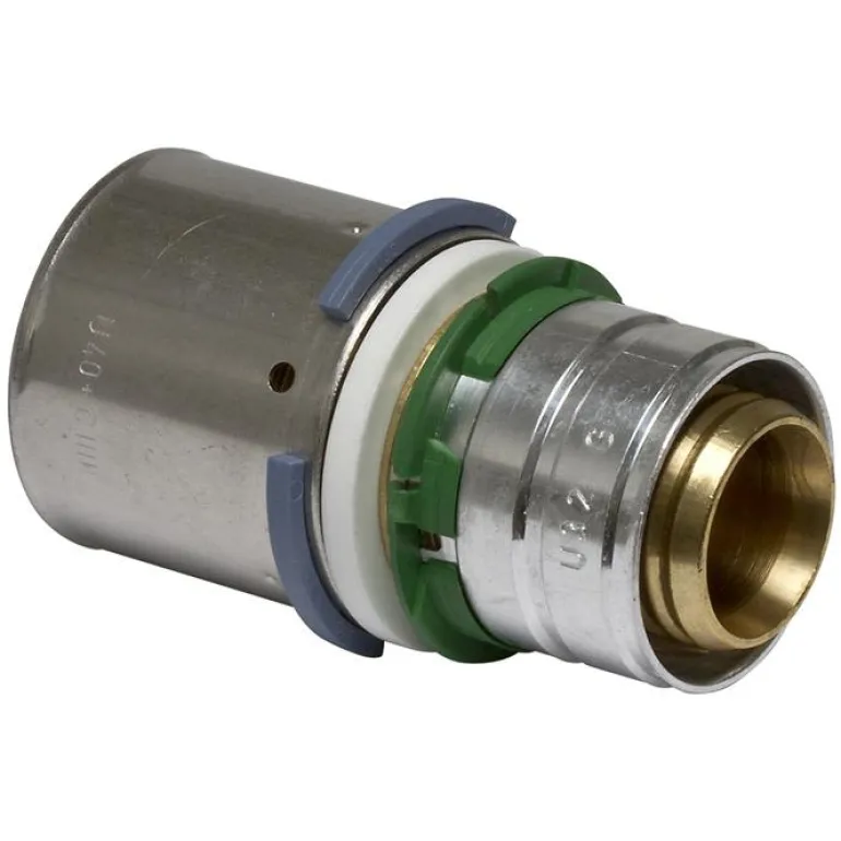 Jatkoliitin, suora, ruostumattomasta teräksestä valmistettu holkki. Putken ulkohalkaisija 40 x 32, puristusholkki. Vuodonilmaisin ilmaisee vuodon, jos liitin vuotaa tiiviyskokeen aikana.