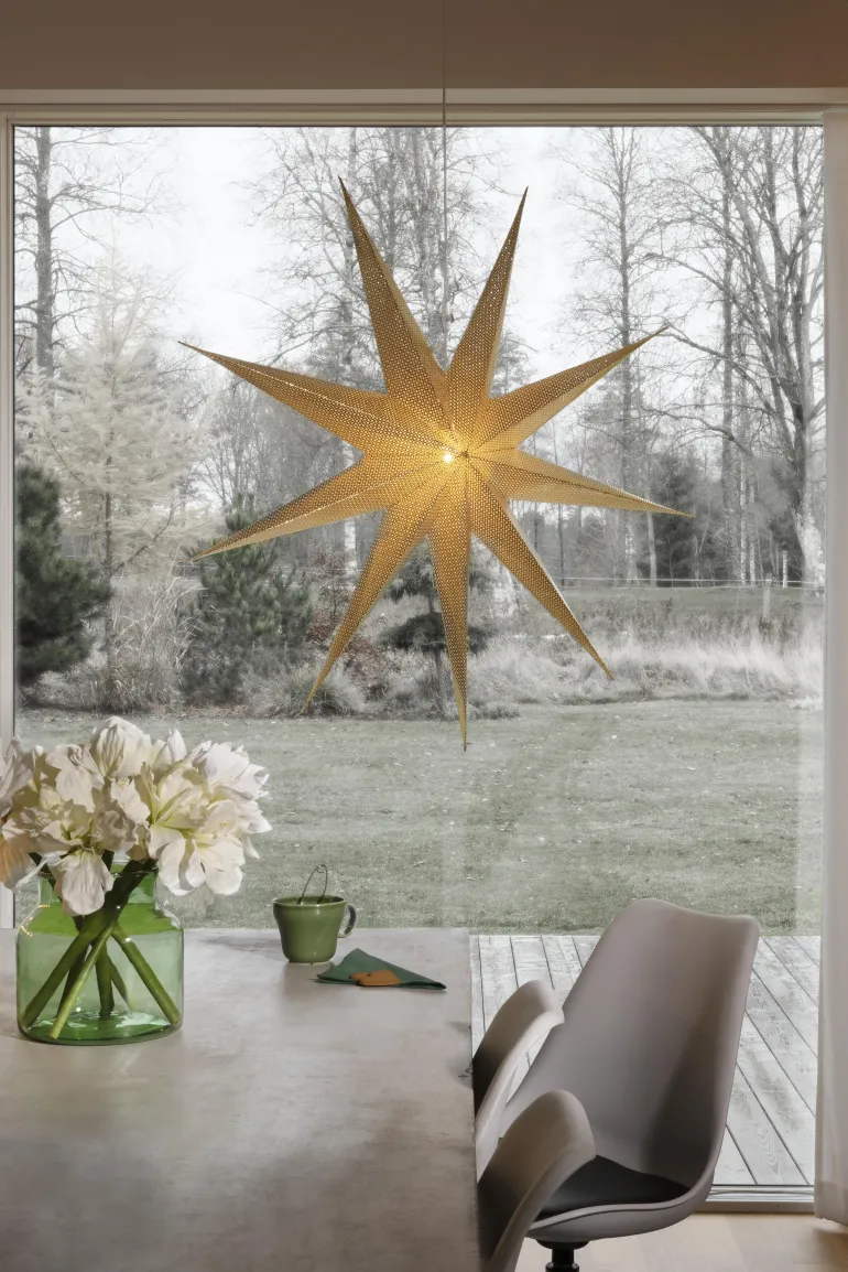 Konstsmide 5902-830 on paperitähti 115 cm, messinki. 9-sakarainen tähti, johdollinen.