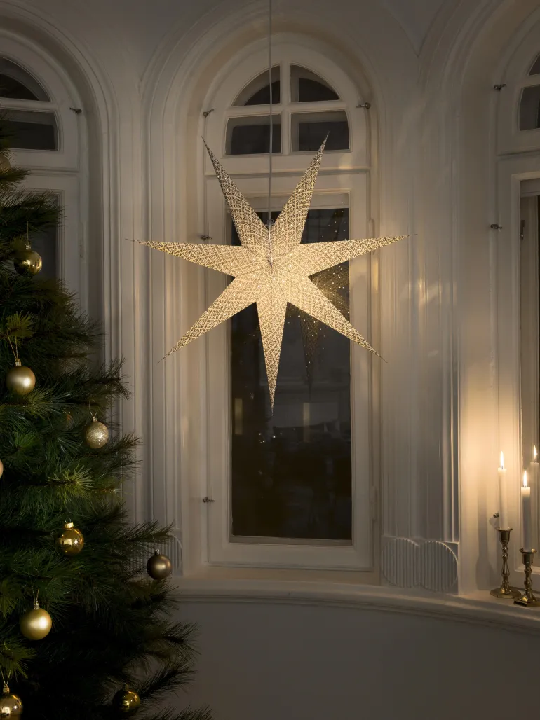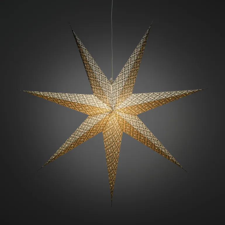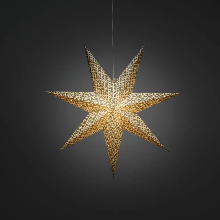 Konstsmide 2930-249 on paperitähti 78 cm. Väri valkoinen/sininen, sisältää johdon (ilman valonlähdettä).