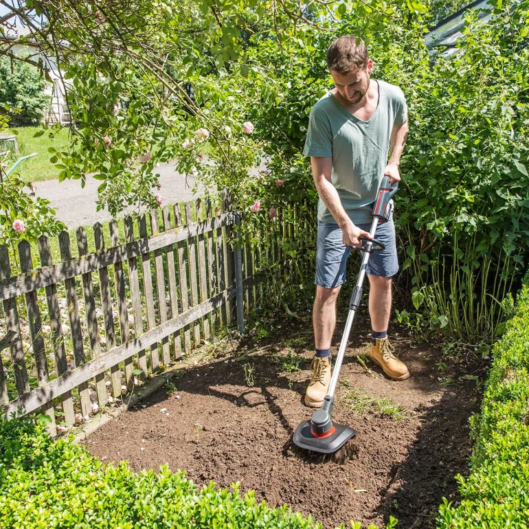 Kätevä akkukäyttöinen jyrsin pieneen puutarhaan. Täydellinen maan muokkaamiseen ja möyhentämiseen sekä rikkaruohojen poistamiseen. Se on helppo varastoida jaettavan työntöaisansa ansiosta, ja pienen painonsa ansiosta sitä on helpompi käyttää kuin perinteistä jyrsintä.