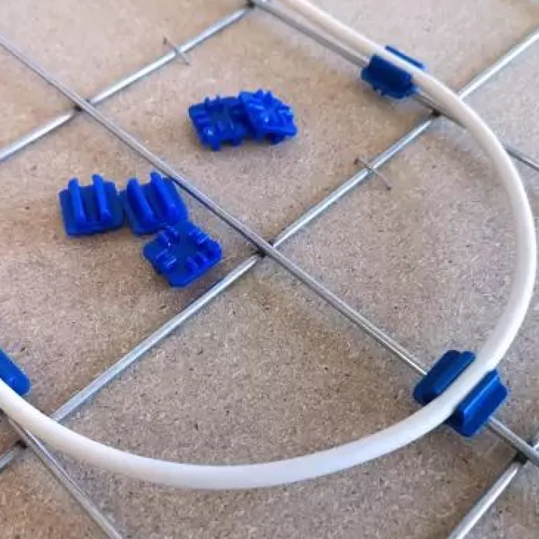 Kaapeliliitin, joka on helppo kiinnittää juuriverkkoon/vahvistusverkkoon. Sopii juuriverkkoon 2,5 mm ja lämmityskaapeliin Ø 4 mm. Yksi laatikko riittää noin 4 m²: lle.