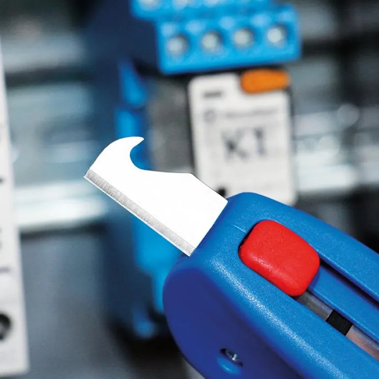 Kaapelinkuorija, jossa on sisäänvedettävä terä, 0,5-6,0 mm² kaapeleille. Säätöpyörä helpottaa käyttöä.