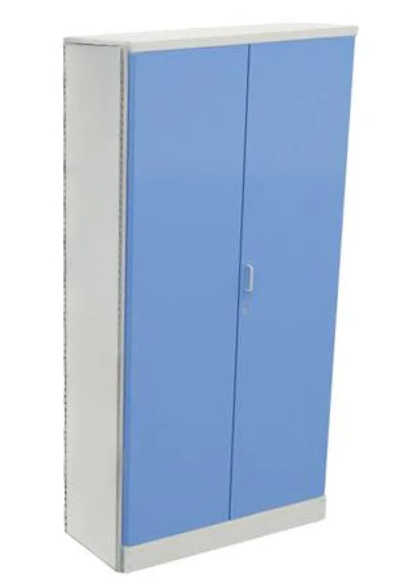 Metallikaappi – harmaa runko ja siniset ovet. Ei sisällä sisäkalusteita. Toimitetaan kokoamattomana.